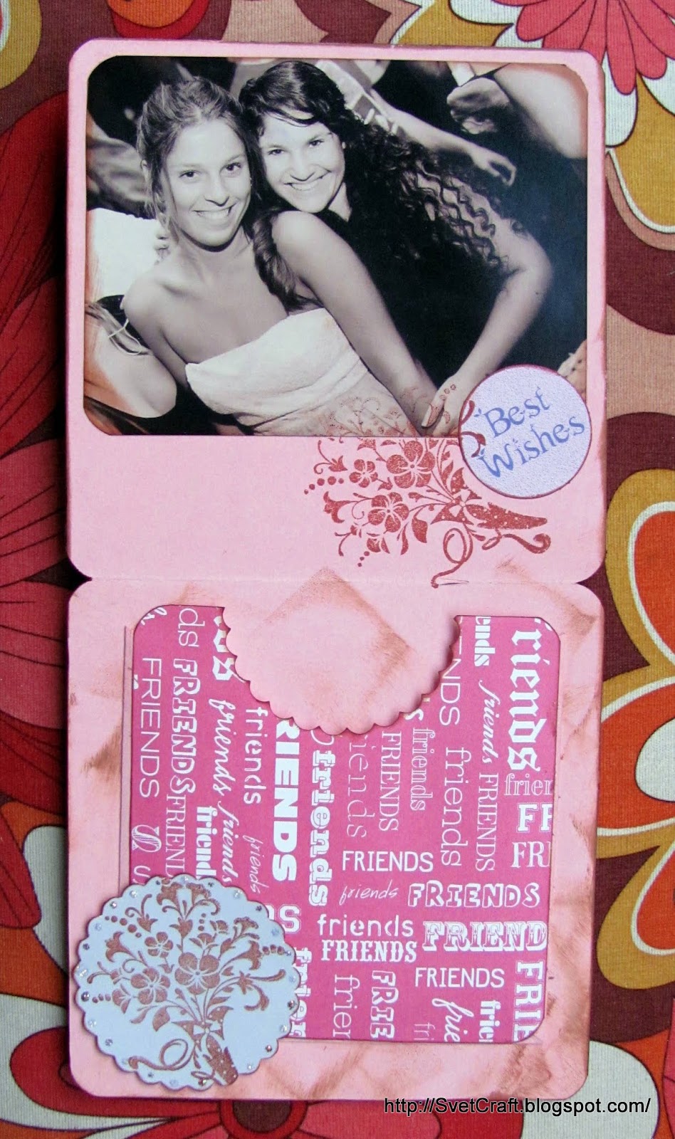 Я начала открытку для участия в задании,  а сейчас она предназначена для подружки моей дочки. Подружка летит в Южную Америку на 8 месяцев ( у нас это обычное явление в этом возрасте ) и моя принцеса хотела розовую открытку на память. Внутри есть их общая фотография и карманчик, чтобы вложить письмо на дорогу.