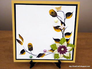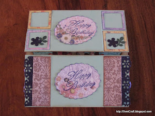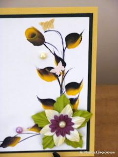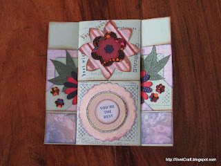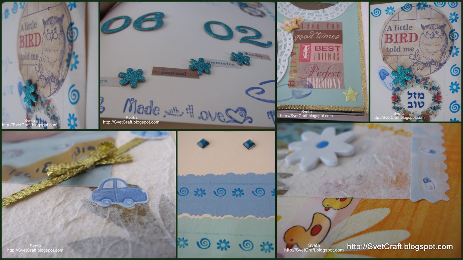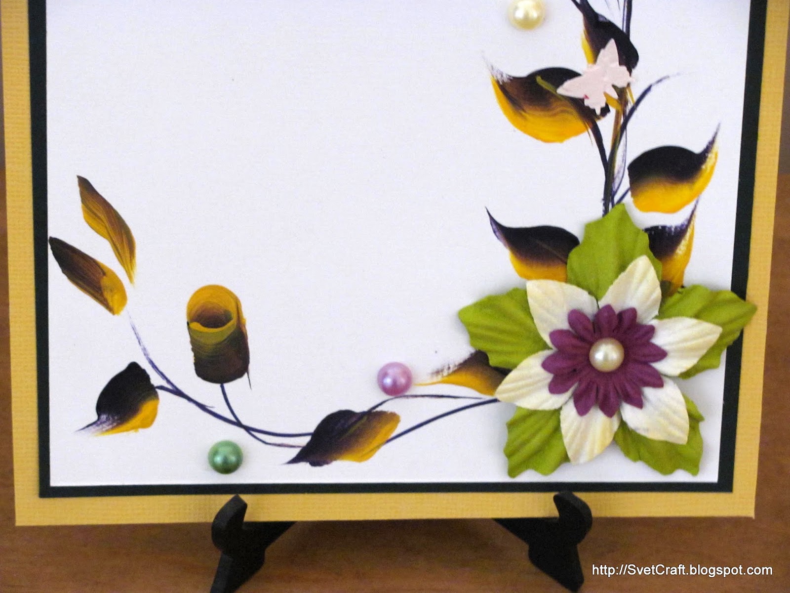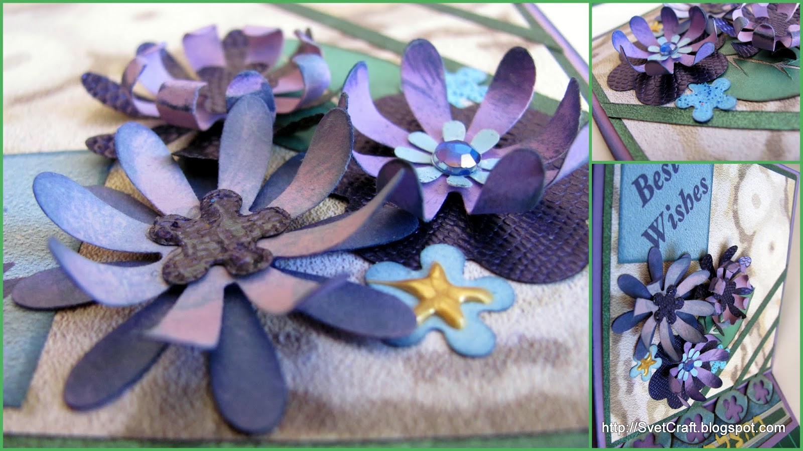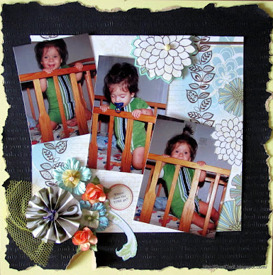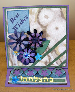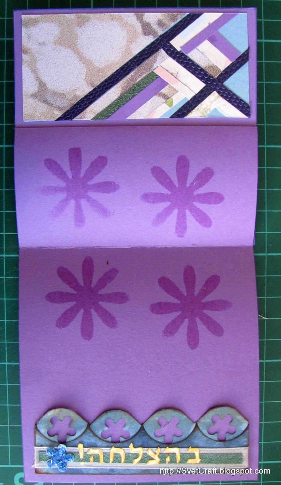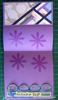 דף בסיס- קרסטוק חלק, עליו קרדסטוק מדוגם עם הבלטה מסט נהדר שקניתי אצל נתנאלה . קרעתי אותו קצת שיהיה מעניין. ועליו עוד דף [חסכון לא היה כאן] שהתעללתי בו טיפה, אחד הפרחים חתכתי חצי, מהשוליים שנאשרו חתכתי פרח נוסף ועוד פרח טיפה גדול יותר חתכתי מקרדסוק חלק. [ להסביר זה הרבה יותר ארוך מלעשות מסתבר]. ועוד חיתוך מדף נוסף עם distress קל [ עם כל האהבה בלתי נגמרת שלי ל - distress , דווקא כאן השארתי קצוות נקיים]. פרח מניפה ופרח בד הם תוצרת עצמית.
