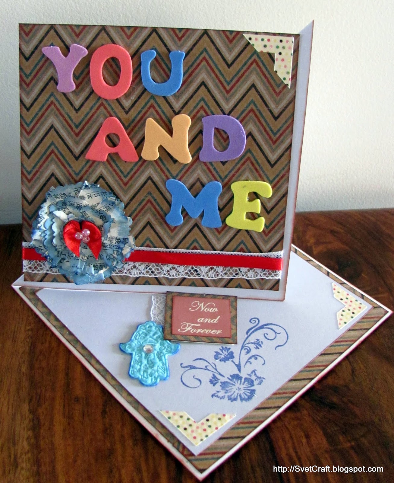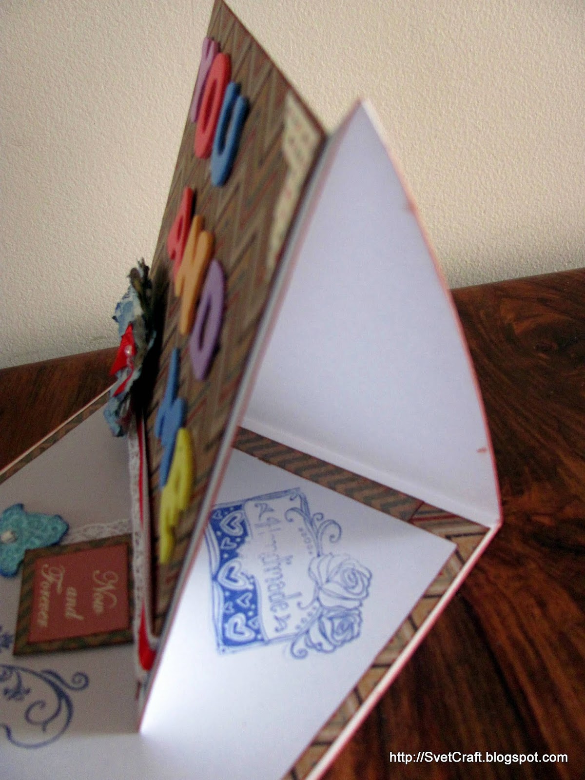 Я начала открытку для участия в задании, а сейчас она предназначена для подружки моей дочки. Подружка летит в Южную Америку на 8 месяцев ( у нас это обычное явление в этом возрасте ) и моя принцеса хотела розовую открытку на память. Внутри есть их общая фотография и карманчик, чтобы вложить письмо на дорогу.