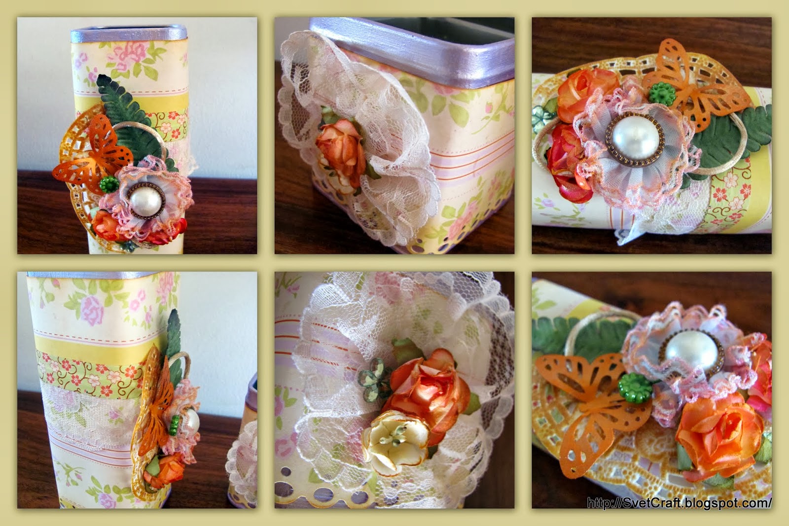 אני בטוחה שהקופסאות האלו מוכרות לכם. במקור היה בהם שוקולד . עיצבתי כאלה מלא בעבר, אבל בעיקר בטכניקה של הדבקת מפיות. והפעם רציתי לשלב בין טכניקות של סקראפ על בסיס קופסת מתכת. וזה מה שיצא:-)