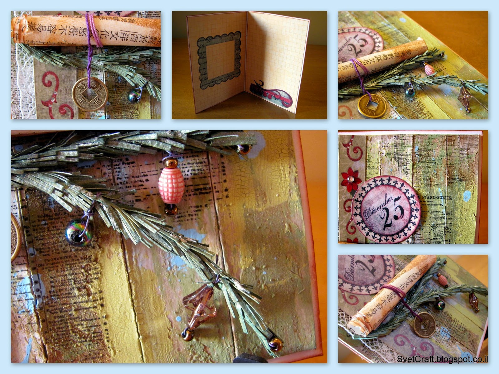 אני בוחרת להציג את העבודה היותר ישנה שלי. התקדמתי והשתפרתי מאז, אבל יש משהו בכרטיס ברכה הזה שגורם לי גאווה. קודם כל הוא נעשה מאפס. לא היה לי בבית שום דבר מתאים חוץ מכמה מדבקות. היו בזכרון ( וב-PINTEREST ) כמה הדרכות שהתאימו. וככה "בניתי " את הגדר וגם את הענף של עץ אשוח. קומפוזיציה היא שילוב של יצירות שונות שראיתי ברשת. וההשראה? אווירת החג בבלוגים מחול. גם אני רציתי קסם .