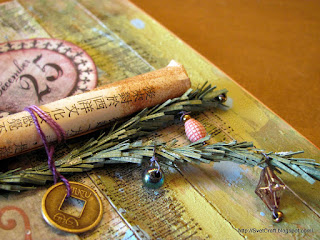 I enjoy making my own embellishments. So, i used olive cardstock for a christmas tree brach. I altered them with encore ultimate metallic green ink, versa color seafoam ink, versacolor vanilla ink, silver ice stickles.