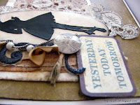 * Дивные штучки - Ch #42. 100% HandMade "100% ручная работа!" [Бумага обработана в ручную, мятая, замазаная чернилами. Шов ручной. Силует рацпечатан, наклеен на плотную основу и расскрашен чернилами. Лента и пуговица викрашену в ручную, цепочка с бусинками собрана в ручную.]